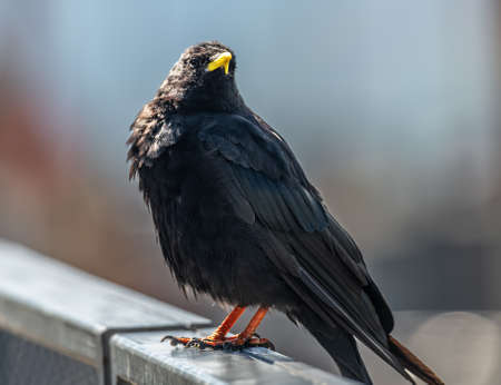 A closeup shot of a black crow sitting on a railing with a blurred background