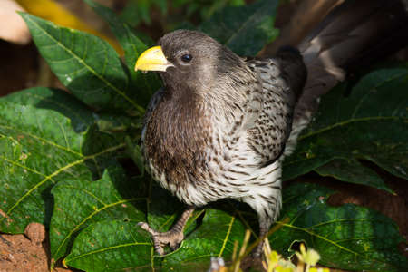 A wet Western Grey Plantain-Eater (Crinifer piscator) standing on a fallen papaya leaf