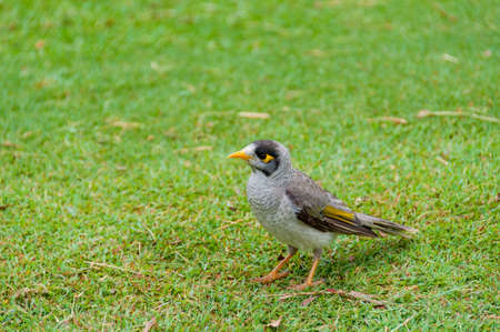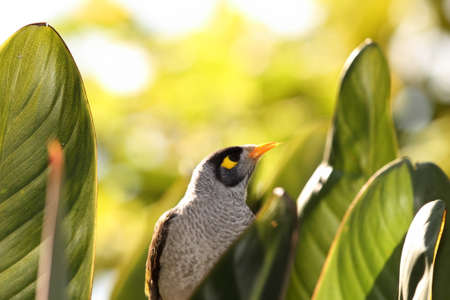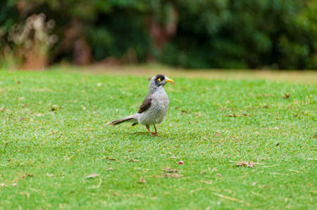 Noisy miner (Manorina melanocephala) small bird, animal sits on the edge of a table in a city park.