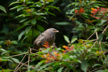 Close-up of a Jungle babbler (Argya striata), perched amongst lush foliage in the garden and looking away.
