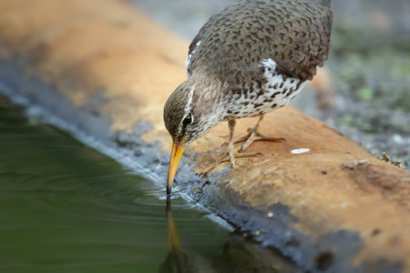 Spotted sandpiper in bright breeding plumage with spots on feathers is foraging near water walking on a log in the wetland.