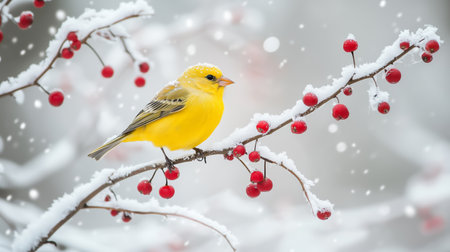 A yellow bird perches on a snowy branch adorned with bright red berries during a gentle snowfall in winter