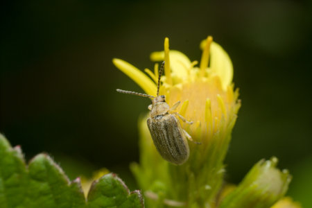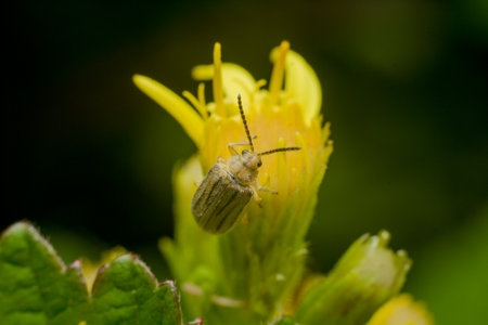 Close-up of a beetle on a yellow flower with green background.