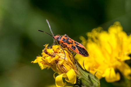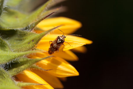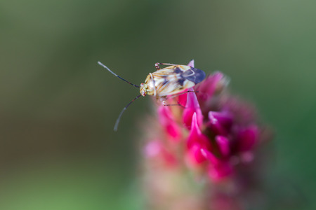 Closeup of a European tarnished plant bug, Lygus rugulipennis sitting on a yellow Tansy flower , Tanacetum vulgare