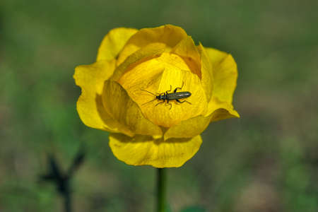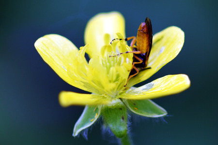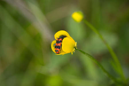 Big yellow buttercup flower with cute bugs resting in it and one is looking straight to the camera lens on blurred green forest background