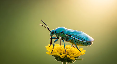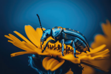 Bug on yellow flower with blue background. Generative AI