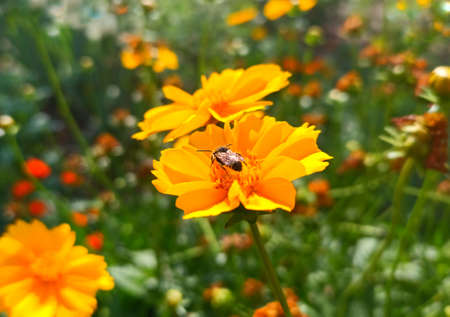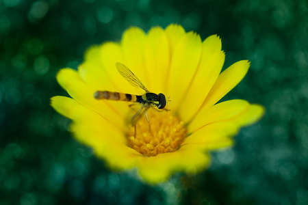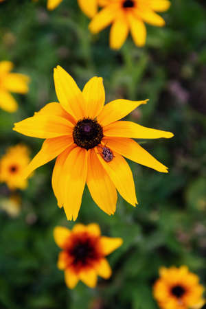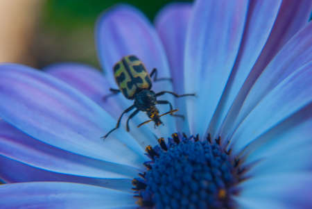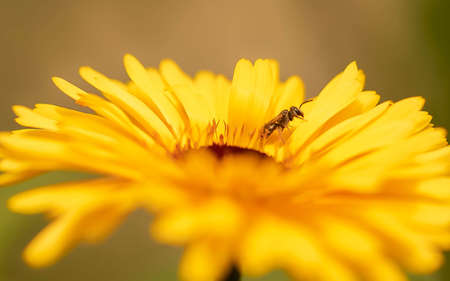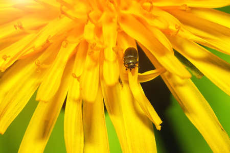 beetle on the yellow garden flower close up in the sunshine