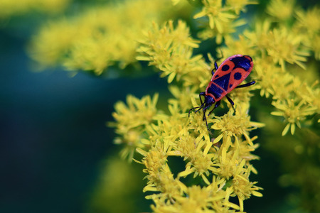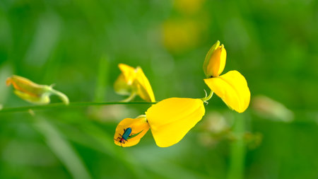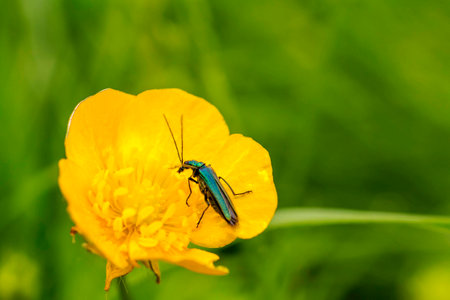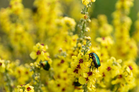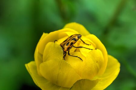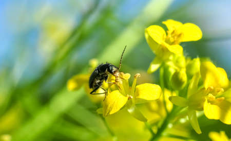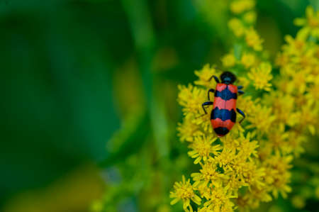 Beetle sitting on yellow wildflowers. Summer sunny day.