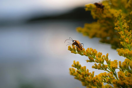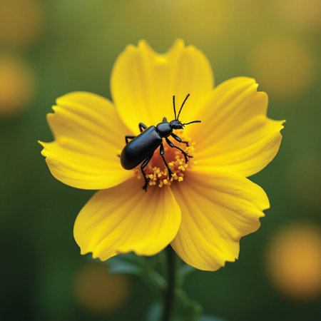 A striking black and yellow beetle rests on bright yellow flowers, capturing the intricate details of nature. This macro shot highlights the beauty of wildlife and ecosystem.