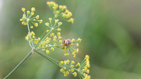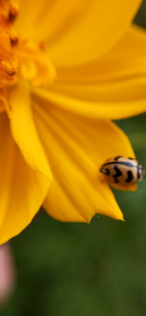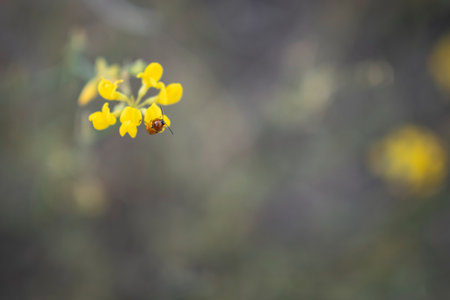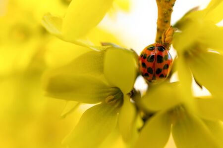 Macro shot of a yellow spotted beetle perched on delicate yellow blossoms