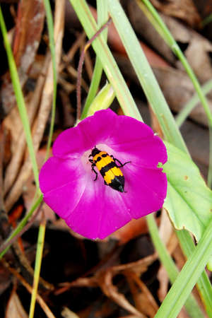 Beetle sitting on the petal of a garden flower.