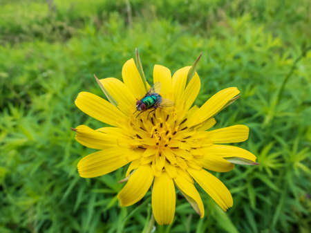 Common green bottle or green blow fly (Lucilia caesar) feeds on pollen and and nectar of yellow flower with green meadow background