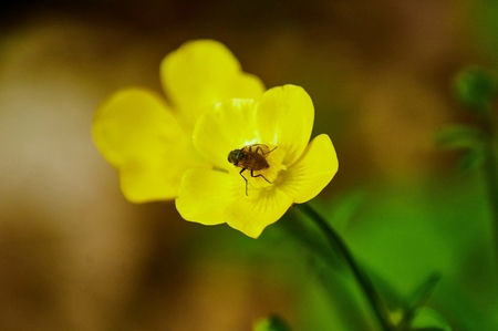 Big yellow buttercup flower with cute bugs resting in it on blurred green forest background
