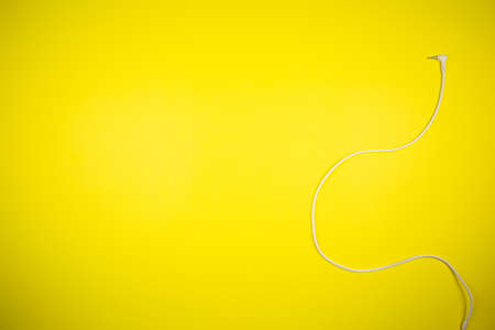 White 3.5mm audio cable from headphones on a yellow background