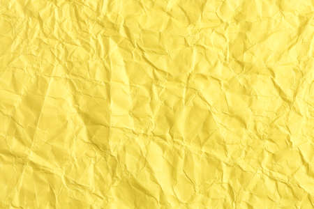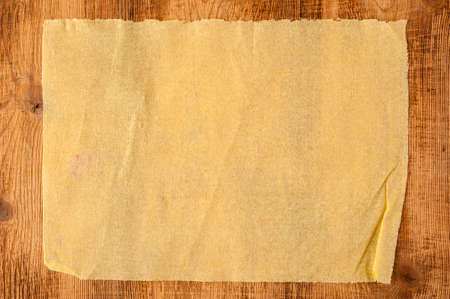 Grunge crumpled yellow beige paper texture on wood background. Distressed and industrial background.