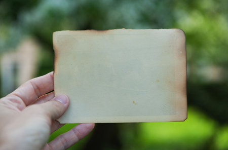 Hand of woman holds the vintage empty paper on green leaves natural background