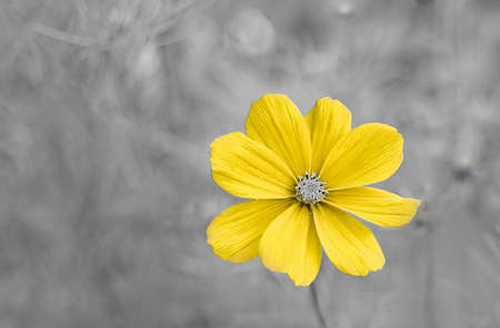 Yellow flower in the garden with gray background. Trendy colors of the year 2021. Copy space.