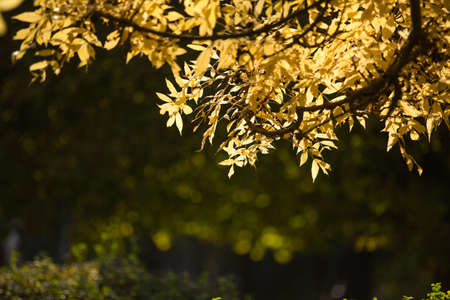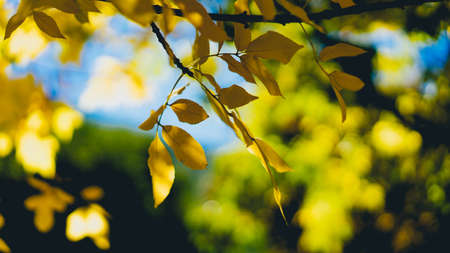 Yellow autumn leaves in the sun rays