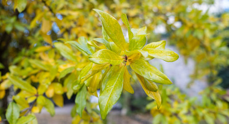 Autumn pomegrande tree with green and yellow leaves. Fruit tree leaves background. Background with yellow pomegrande tree. Copy space. Place for text.