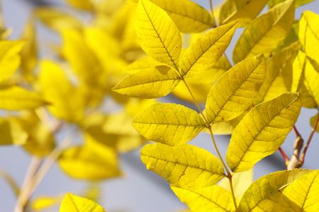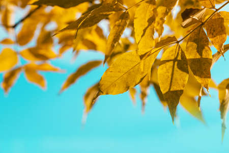Abstract autumn background. Vibrant yellow ash leaves close up. Tree branches with bright foliage on a blue background
