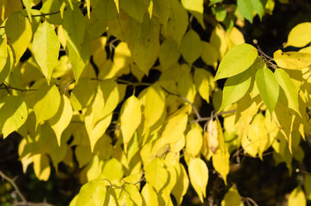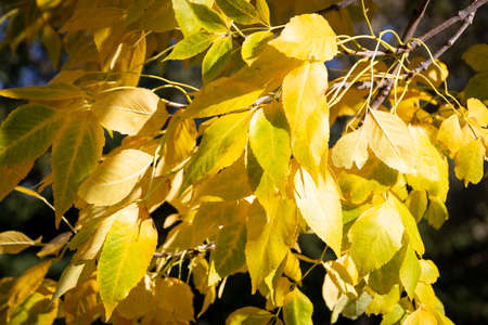 Autumn nature. Leaves and bushes with the yellow leaves in park in spring. Autumn leaves on branches in fall.