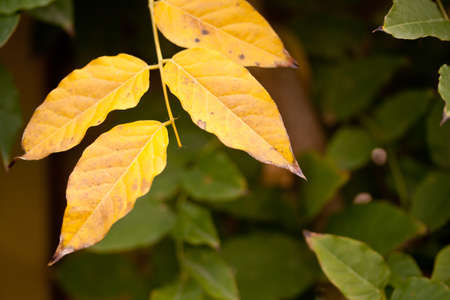 Autumnal golden osage orange leaves close-up view with selective focus on foreground