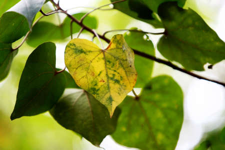 Autumn and spring. Green and fallen autumn leaf on green yellow background