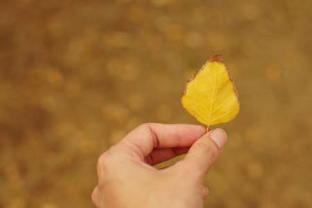 Female hand holding yellow autumn birch leaf in the park