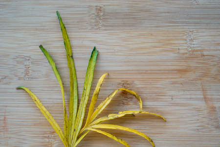 change of color leaves on rustic wooden background. Climate change concept