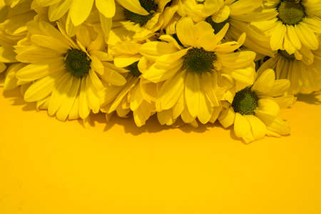 Yellow chrysanthemum bouquet on yellow background. Copy space