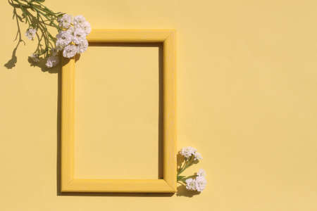 Empty wooden frame and white flowers on a yellow background.