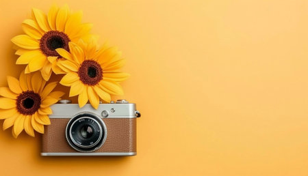 A vibrant summer scene featuring three sunflowers arranged beside a classic vintage camera on a sunny yellow background.