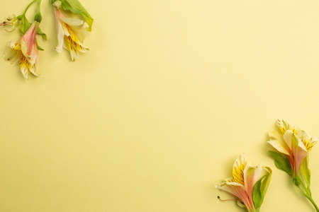Yellow Alstroemeria flowers on yellow background. floral decoration. flat lay, top view, copy space