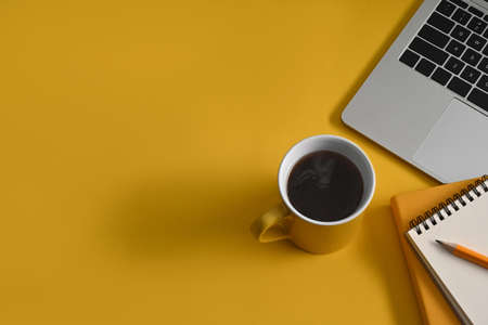 Cup of coffee, laptop computer and notebook on yellow background with copy space.