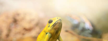 Golden Poison Arrow Frog (Phyllobates terribilis) in natural rainforest environment. Colorful bright yellow tropical frog. Nature, wildlife, zoology, herpetology, science, zoo laboratory, terrarium