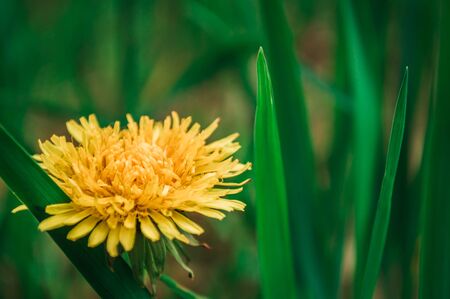 Close-up yellow dandelion in green grass. Macro photo.