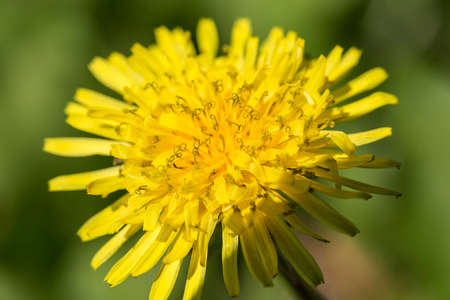 A bright yellow dandelion on a green blurry background in nature.