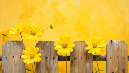 Springtime showing bright yellow daisy-like flowers bloom along a weathered wooden fence against a textured yellow wall keywords: yellow flowers,...