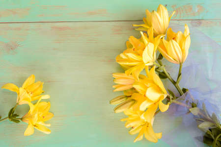Close up of Lily flowers on the wooden background