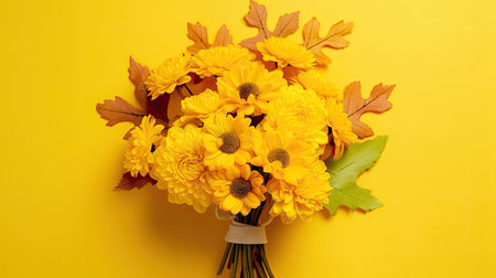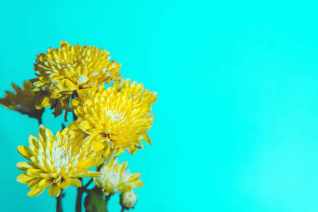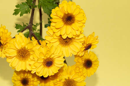 Yellow chrysanthemum bouquet on yellow background. Copy space
