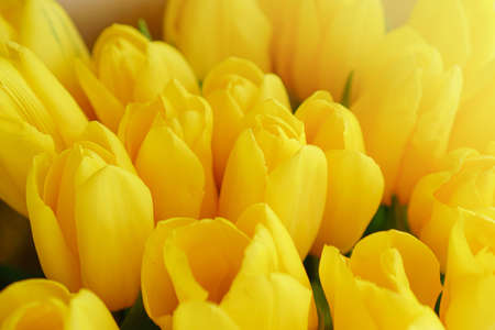 Detailed close-up of many buds of yellow tulips.