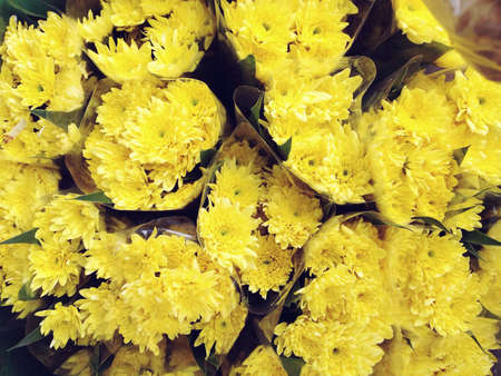 Bright yellow background made of chrysanthemum flowers. Spring wallpaper.