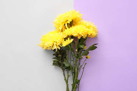 Yellow chrysanthemum flowers on color background