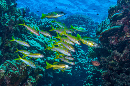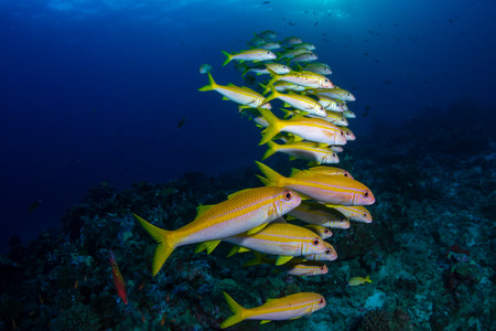 A school of yellow snapper on a dark blue tropical coral reef