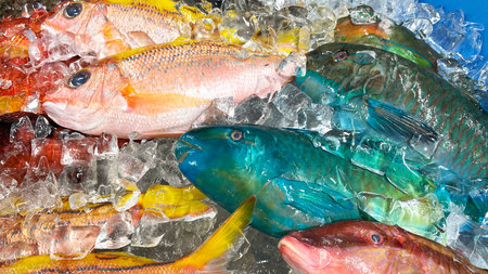 Fresh and colorful Okinawan fish lined up at the market