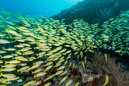 Large school of yellow snapper on a tropical coral reef in Thailand