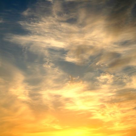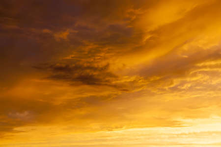 Golden sky with clouds at sunset as background.