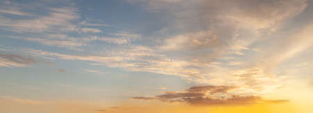 Panorama with orange sunset in cloudy sky with clouds. Background with sky at sunrise