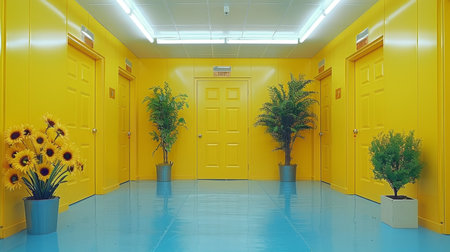 Self storage unit corridor showcasing vibrant yellow doors for rental storage units
