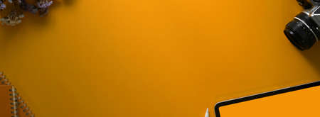 Top view of creative worktable with digital tablet, camera, notebooks and copy space on yellow desk